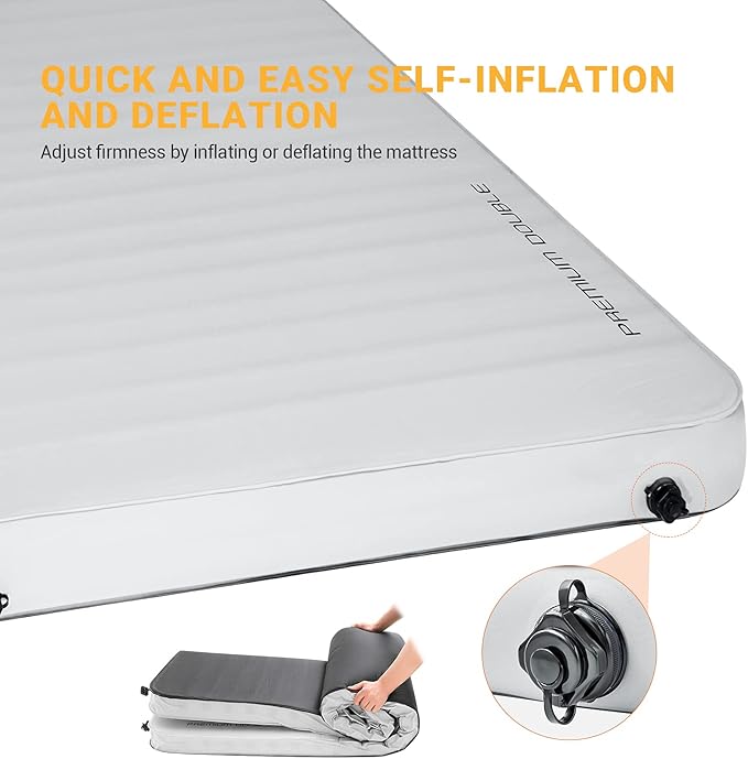 - ADJUSTABLE SOFTNESS & 3 INCH THICKNESS FOR COMFORT ON ANY SURFACE: With a 3" thickness, this sleeping pad ensures you won't feel any rocks or uneven ground underneath, providing ultimate comfort for a peaceful night's sleep. The pad’s adjustable softness allows you to customize your sleep experience based on your personal preference, making it suitable for various terrains.