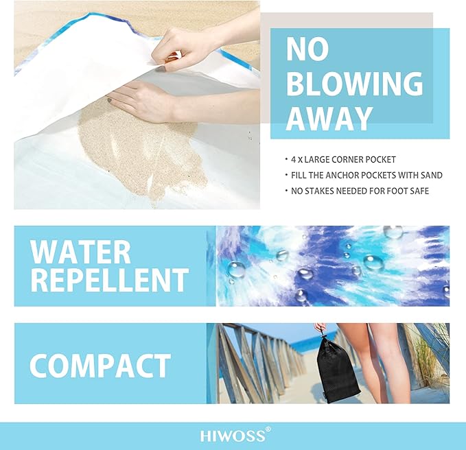 - 【UNIQUE DESIGN, 4 CORNER POCKETS】The eye-catching designed beach blanket, with quality in appearance, will make you stand out on the beach! You can easily find your family and friends on the beach without worrying about getting lost. At the same time, the beach mat is designed with four built-in corner pockets that prevent the blanket from blowing away.