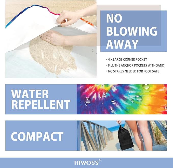 - 【UNIQUE DESIGN, 4 CORNER POCKETS】The eye-catching designed beach blanket, with quality in appearance, will make you stand out on the beach! You can easily find your family and friends on the beach without worrying about getting lost. At the same time, the beach mat is designed with four built-in corner pockets that prevent the blanket from blowing away.