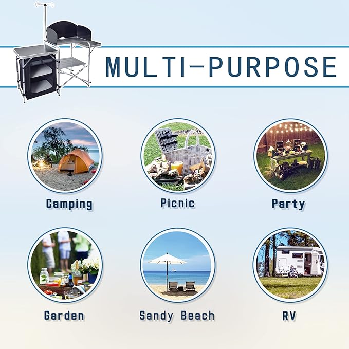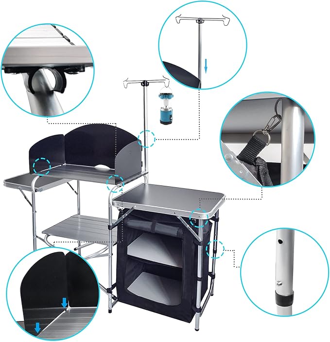 CampLand Folding Cooking Table Outdoor Portable Cook Station Aluminum Camping Kitchen with Storage Organizer (Black)