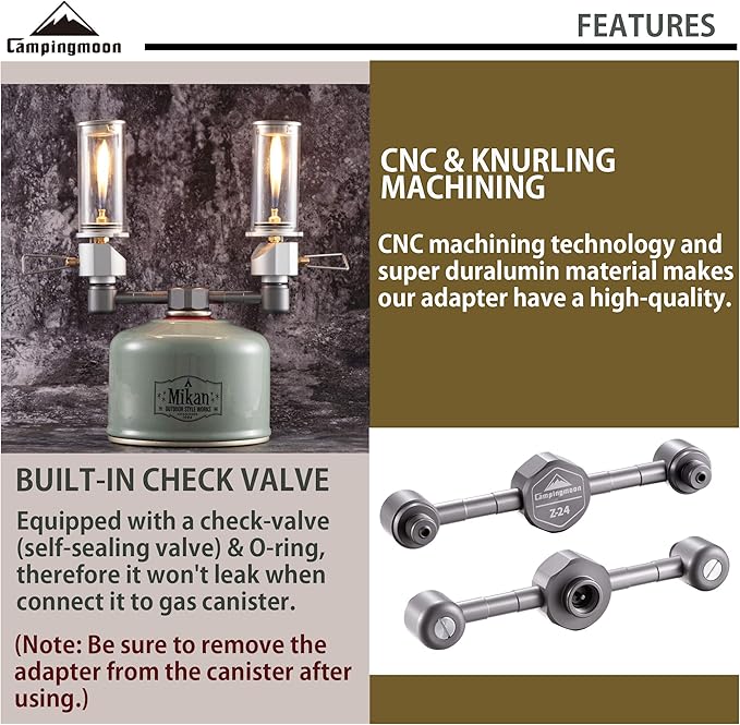 - BUILT-IN CHECK VALVE:Equipped with check-valve (self-sealing valve), therefore it won't leak when connect it to gas canister.(Note: Please remove the adapter from the canister after using.)