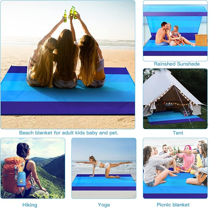 - ๐๏ธBeach Blanket Oversized:Good wear resistance,Dry-Quick,Can also be used as a rain shed,sunshade,tent,toddler crawl,Emergency mat,Feel comfortable lying down,Won't irritate your skin,Better professional fabric sewing.