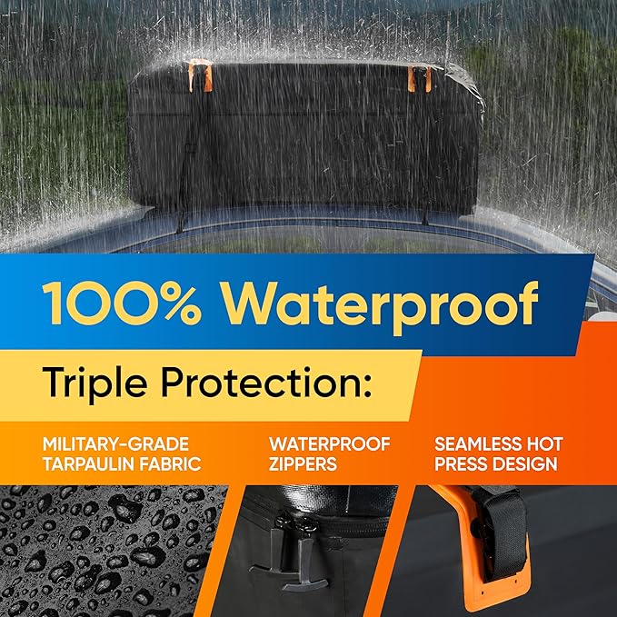 - CAR TOP CARRIER FOR ALL CONDITIONS – Bad weather? No worries. Your car roof storage bag is 100% waterproof and keeps your things safe through snow, sun, or sleet because of its coated tarpaulin and zippers!