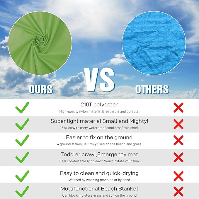 - ๐๏ธBeach Blanket Oversized:Good wear resistance,Dry-Quick.Can also be used as a rain shed,sunshade,tent,toddler crawl,emergency mat. Feel comfortable lying down,Won't irritate your skin,Better professional fabric sewing.