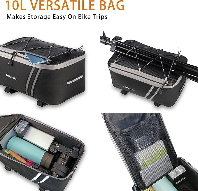 - 10L ENLARGED CAPATITY: Our bike carrier bag includes a main compartment, a extra top zippered pocket, a added inner net pouch and adjustable elastic cord, which helps keep your riding essentials well organized. Dimension of 13.4in/34cm x 6.7in/17cm x 6.3in/16cm(L x W x H) , 10l capacity enough to contain wallet, phones, power bank, small speaker, towels, T-shirt,food, drinks,bike locks , small tools, water bottles, sunglasses etc.