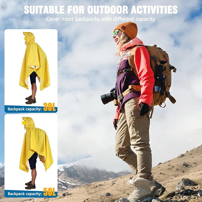 - Breathable & Comfortable: Don't worry that it will make you very hot because the arm holes & bottom are loose enough to allow air circulation.The size is large enough to cover up a backpack as well. It can help keep your backpack dry and prevent water from seeping through and damaging your items. It offers excellent freedom of movement, which makes it very comfortable to wear. Adjusting the snap fasteners on each side it can accommodate a range of body sizes and shapes.