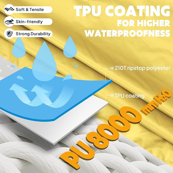 - Waterproof and Sturdy Material: The rain poncho is made of 210T ripstop polyester + TPU coating, this rain poncho is PU8000MM waterproof.To enhance the waterproofing capabilities of a rain poncho,we use techniques such as seam sealing or taping to ensure that water cannot seep through the seams.It comes with a drawstring hood, hook and loop fasteners along the sides ensures the optimal fit,which is good for protecting your head and face.