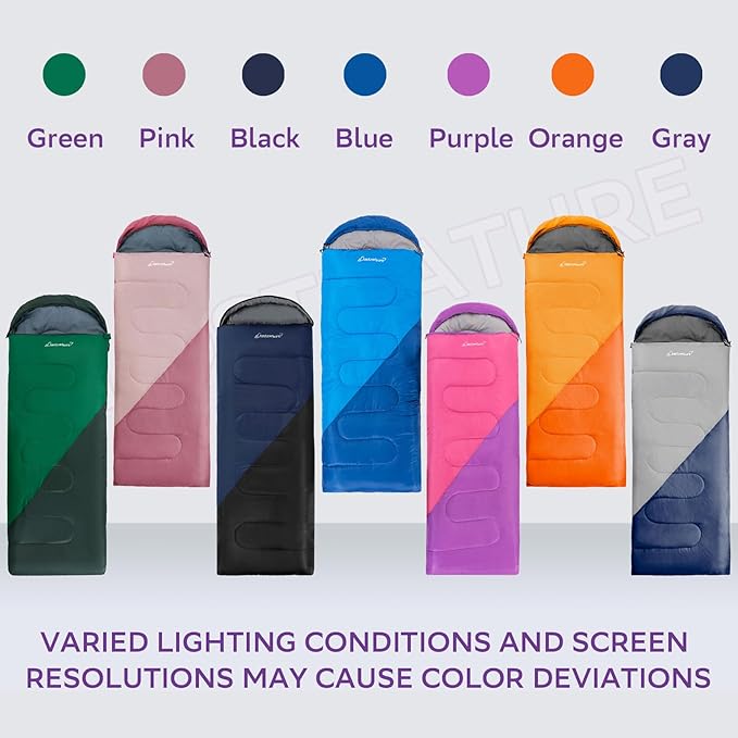 - SUPERIOR MATERIAL: This lightweight sleeping bag with a perfect balance between warmth and quality. High air permeability shell combined with hollow fiber fillings provides a warm and dry space no matter in Winter or Summer! No more shivering uncontrollably sleeping in the backcountry. The fabric is waterproof and difficult to stain, easy to clean by wiping
