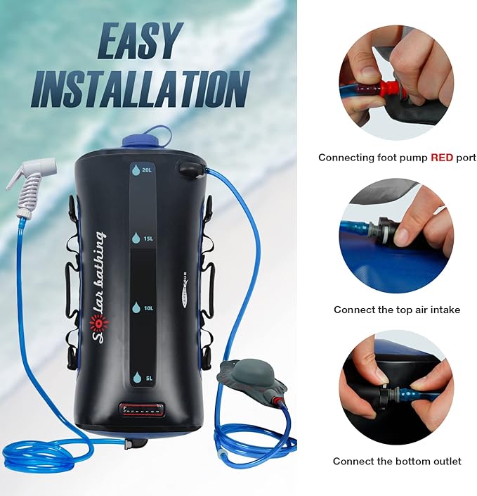 - LARGE CAPACITY: With a generous capacity of 20 liters or 5.4 gallons, this camping shower bag provides ample water storage for a satisfying shower experience. The large capacity allows multiple showers or extended use before needing to refill the bag.Additionally, a one-way return valve prevents water from flowing back into the shower bag, ensuring water integrity.