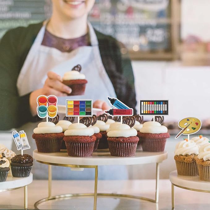 Art Palette Cupcake Toppers,Painting Themed Happy Birthday Party Decor, Artist Palette Graffi Paint Brush Boy Girl Party Decorations Supplies,Rainbow Glitter Set of 18