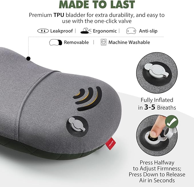 - ππππ πππ ππππ ππππππππππ: Unlike those traditional integrated air pillows which can easily develop a leak and become useless, our camping pillow for backpacking consists of a machine washable foam pillowcase and a removable air bladder which is made of premium thickened TPU to prevent air leaks effectively. Assure you a clean and luxurious night sleep outdoors.