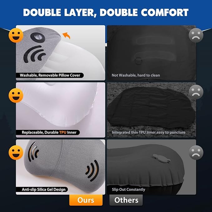 - ππππ πππ ππππ ππππππππππ: Unlike those traditional integrated air pillows which can easily develop a leak and become useless, our camping pillow for backpacking consists of a machine washable foam pillowcase and a removable air bladder which is made of premium thickened TPU to prevent air leaks effectively. Assure you a clean and luxurious night sleep outdoors