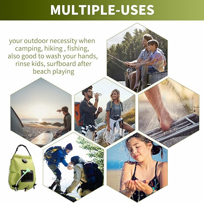 • WIDE RANGE OF USES - This camping showers is suitable for outdoor activities such as camping, backpacking, hiking, fishing or hunting, our portable shower bag is one of the indispensable outdoor equipment accessories for you and your family.It is also the best gift for Father's Day and the perfect camping accessory for men your husband and your children.