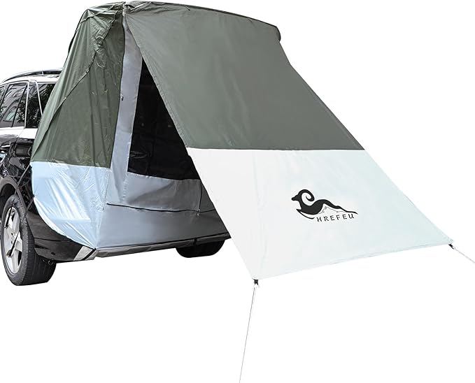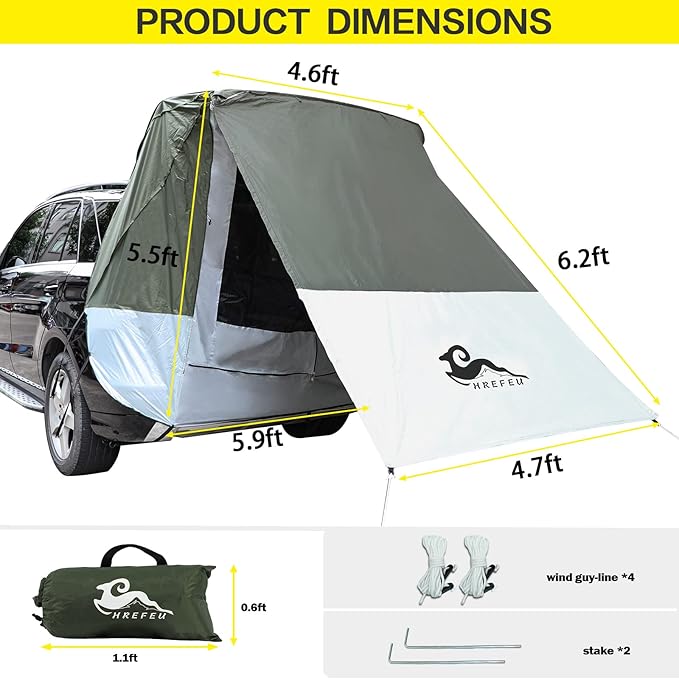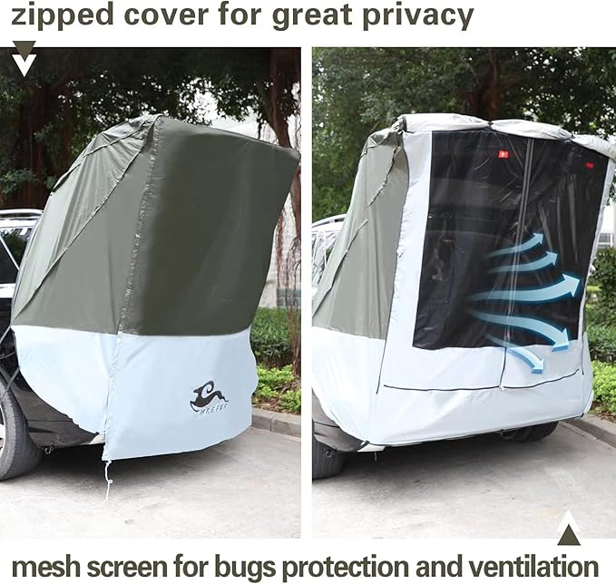 - 【Universal for any size of SUV】This tailgate tent attaches to the rear of any size SUV, Car, Van, CUV, MPV with its elastic universal fit design. Not suitable for cars with double doors, side doors, and tires on the back.Because it is a universal size, there may be some differences in used for different car models. It may be compact or there may be have some space, but they can all be used normally;