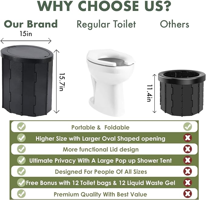 Portable Toilet Kit Adults, Pop Up Privacy Tent, X Large Camping Folding Toilet, 12 bags, 12 pack Liquid Waste Gel, Washable Foldable For Travel,RV, Outdoor