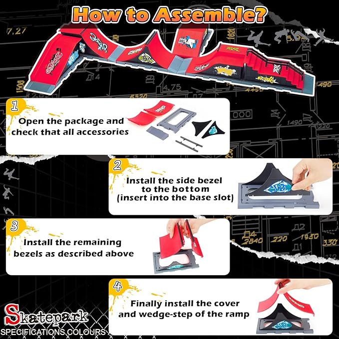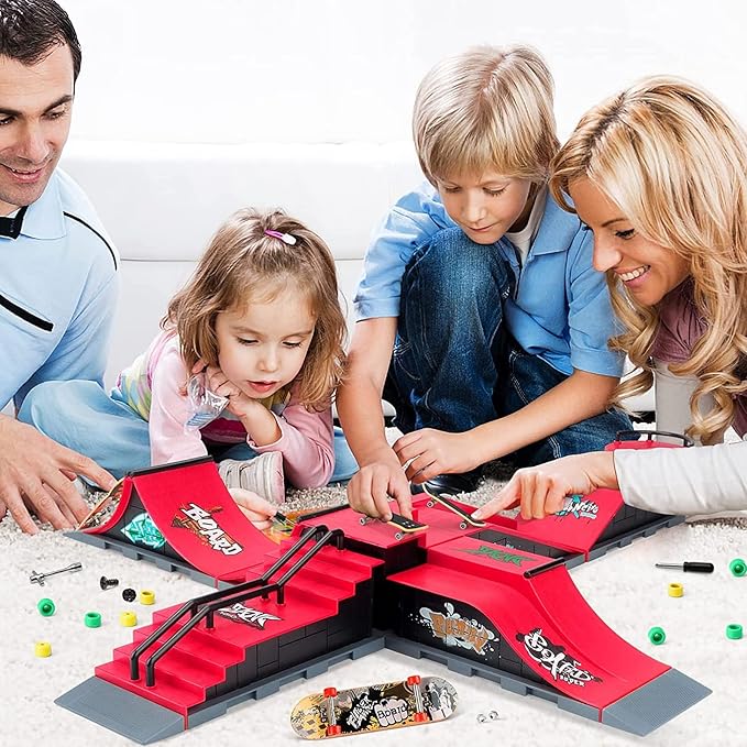 - 【Complete Kit】Get a huge 6 in 1 Fingerboard Skatepark Set , Includes 6 skateboard ramps, 6 mini fingerboards, 1 mini fingerboard display stand and 4 skateboard wheel replacement tools and skate park ramp connectors kit. Different kinds of mini finger toys make your skateboard park more special and interesting.
