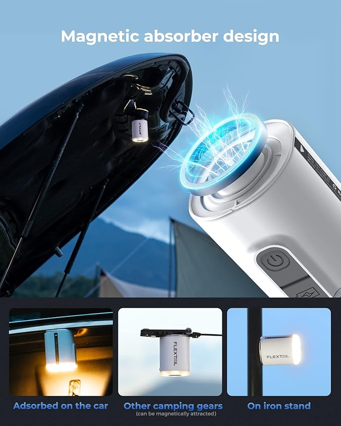 - ➤【MAGNETIC DESIGN & CAMPING LANTERN】- The built-in magnet ring, allows our mini pump to be strongly attracted by iron, steel, nickel, and other ferromagnetic material. Combined with the function of magnetic ring and camping light, our battery air pump can be fixed in more places to provide lightings, such as cars, iron frames, or other camping equipment.(Please make sure the material can be magnetically attracted)