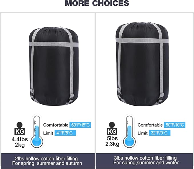 • TEMPERATURE RANGE: 3lbs filling sleeping bags is comfort in 41°F(0 degree cold weather) and fits temperature range 32-50 °F/0-10 °C. Females are recommended to choose the thicker sleeping bags. 2lbs filling sleeping bags fits temperature range 41-59 °F/5-15 °C.