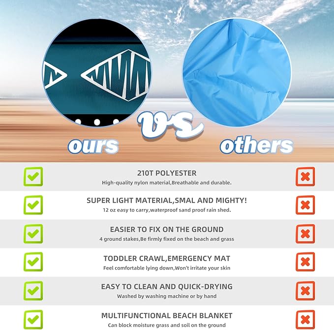- ๐๏ธBeach Blanket Oversized:Good wear resistance,Dry-Quick.Can also be used as a rain shed,sunshade,tent,toddler crawl,emergency mat. Feel comfortable lying down,Won't irritate your skin,Better professional fabric sewing.