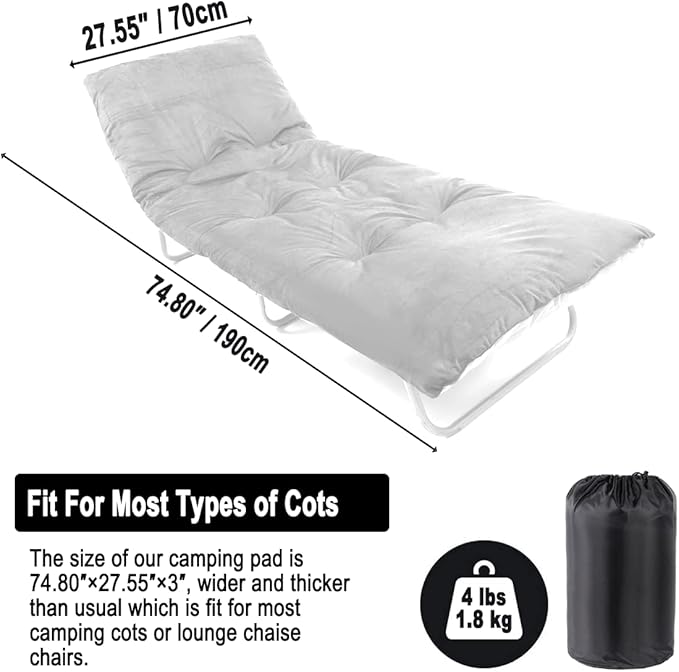 - Convenient and Easy to Carry: The sleeping camping cot pad can be easily installed or folded up into an included storage bag .