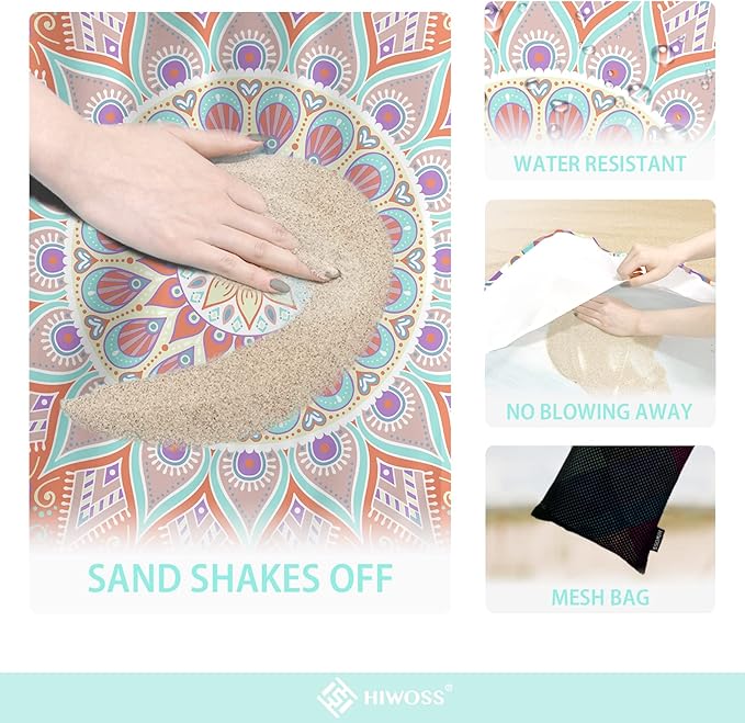 - 【UNIQUE DESIGN, 4 CORNER POCKETS】The eye-catching designed beach blanket, with quality in appearance, will make you stand out on the beach! You can easily find your family and friends on the beach without worrying about getting lost. At the same time, the beach mat is designed with four built-in corner pockets that prevent the blanket from blowing away.