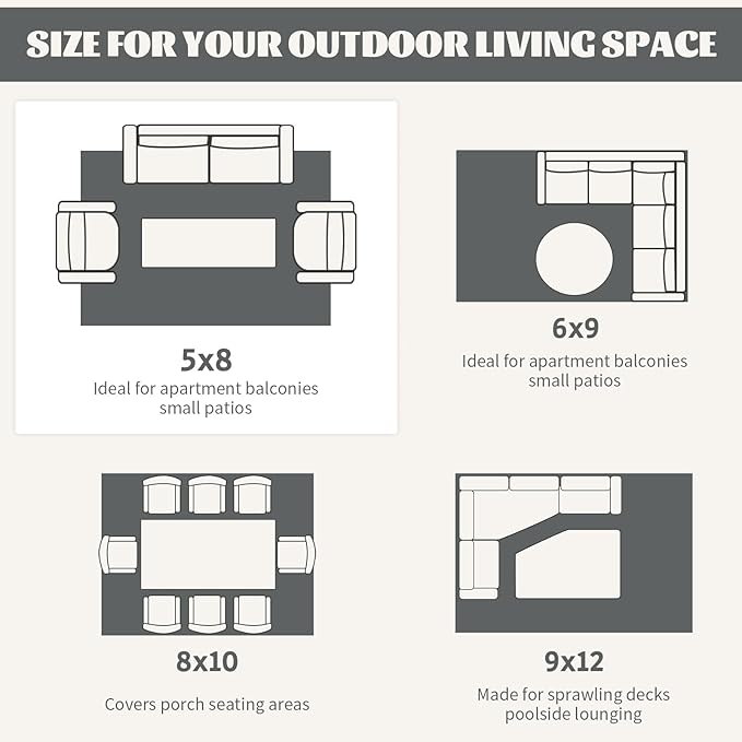 - Waterproof & Easy Cleaning: The outdoor/indoor rugs are water proof and easy to clean. Our rugs resist lots of stains: milk, wine, cola, grass and more. Simply sweep away dirt with water and the breathable design make it possible to airing dry in few minutes. If you are outside without water, you can just wipe it with cleaning cloth or shake it, rid the dust off. Great for keeping dogs out of the dirt.