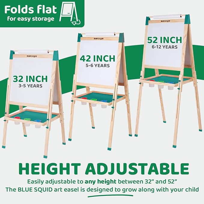Blue Squid Art Easel for Kids - Dual-Sided Adjustable Wooden Painting Easels, Ideal Christmas Gift for Toddlers and Kid - with Magnetic Chalk Board, White Board & Paper Roll, Includes Accessories