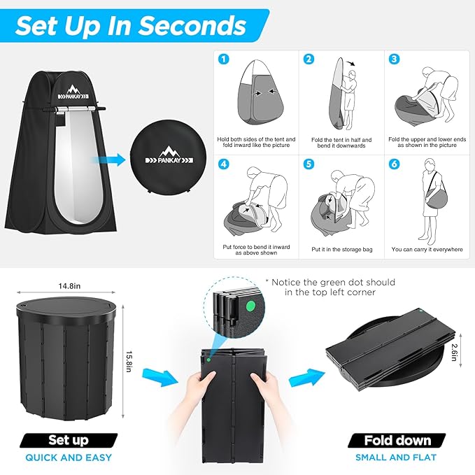 - MULTI-USE POP UP TENT - Empowering you with instant privacy protection! The PANKAY shower tent is 47.2" L x 47,2"W x 74.8" H, provides a private space for using the camp toilet and having a quick shower during outdoor adventures. Also suitable as a changing room and outdoor lounge. The silver coating effectively blocks sunlight and ensures privacy. Constructed with tear-resistant 190T opaque polyester and anti-rust steel flat wire, the camping toilet tents guarantees premium durability.