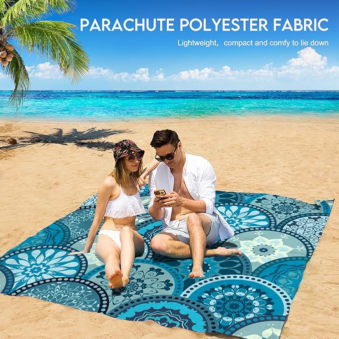 - ๐๏ธBeach Blanket Waterproof Sandproof:78''ร81'' Size beach blanket comfortable fit 1-5 adults,Odorless.Made by parachute fabric,Rip-stop 210T polyester,very light and small after folding.12 oz easy to carry,small and Mighty!