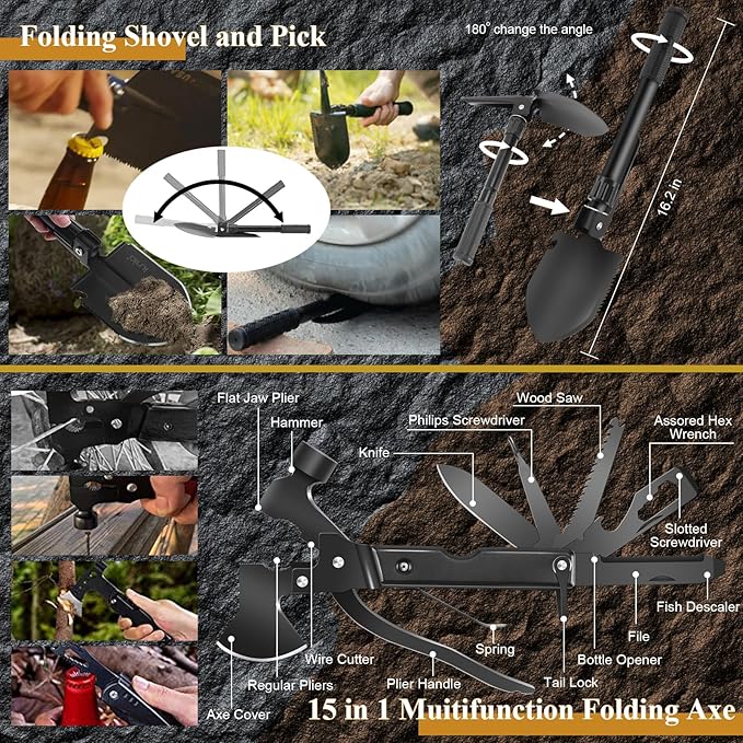 - 【High-quality Survival Gear and Equipment for Camping or Home Needs】 The survival first aid kit offers high-quality and professional tactical survival tools to ensure you will be well-prepared under any emergencies. The kit contains: 14 in 1 hatchet, folding shovel and pick, collapsible tent lantern, tactical flashlight, survival bracelet,multi-tool card, fire starter, emergency blanket, 12-hour glow stick, wire saw, and emergency rain poncho.