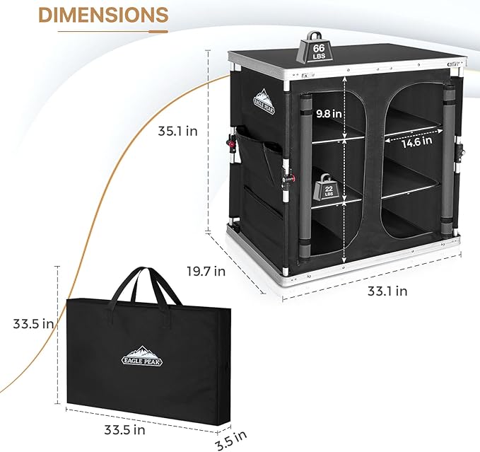 - EXCELLENT QUALITY: EAGLE PEAK camping kitchen table is made of durable MDF tabletop, waterproof and stain resistant material, and is easy to clean. The frame is made of anti-rust powder-coated aluminum pipe and polyester 600D with PVC coating. The aluminum alloy bracket with corner leg support system ensures the strong stability for long lasting use. This table supports up to 66 lbs.