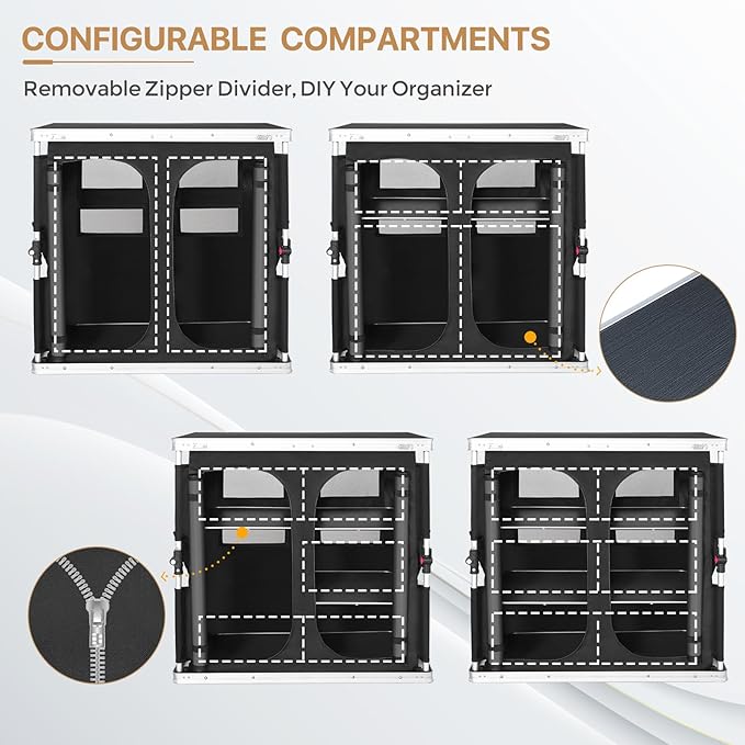 - UNIQUE DESIGN: EAGLE PEAK folding camping table features a large 33.1 x 19.7 inch top surface area, center storage, and six large and small side pockets. The center zippered compartment offers a large accessible storage space to help organize your camp and protect your food from the bugs and animals. The versatile 3-tier storage organizer can be changed from 1 to 3 levels customized to your needs.