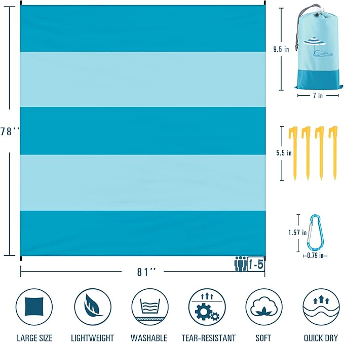- ๐ดBEACH BLANKET SANDPROOF WATERPROOF:78''ร81'' fits 1-5 adults.Made with ripstop 210T polyester.The sand will fall down when you shake the blanket.The little water left behind will dry out in minutes.