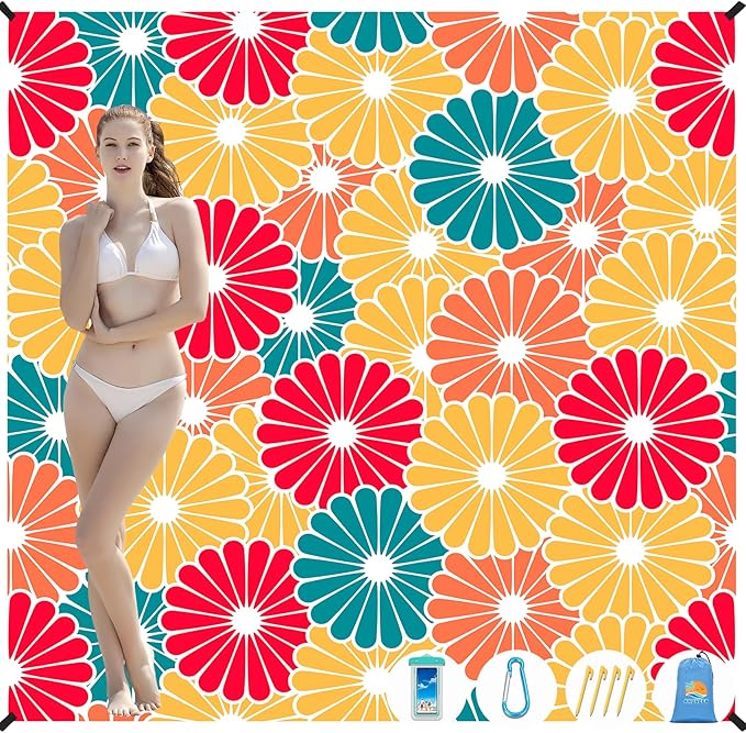 - ๐ดBEACH BLANKET WATERPROOF SANDPROOF:78''ร81'' size beach blanket is made of parachute fabric,odorless,can be used by 1-7 adults simultaneously.Rip-stop 210T polyester, lightweight and compact after folding.Easy to carry and use.