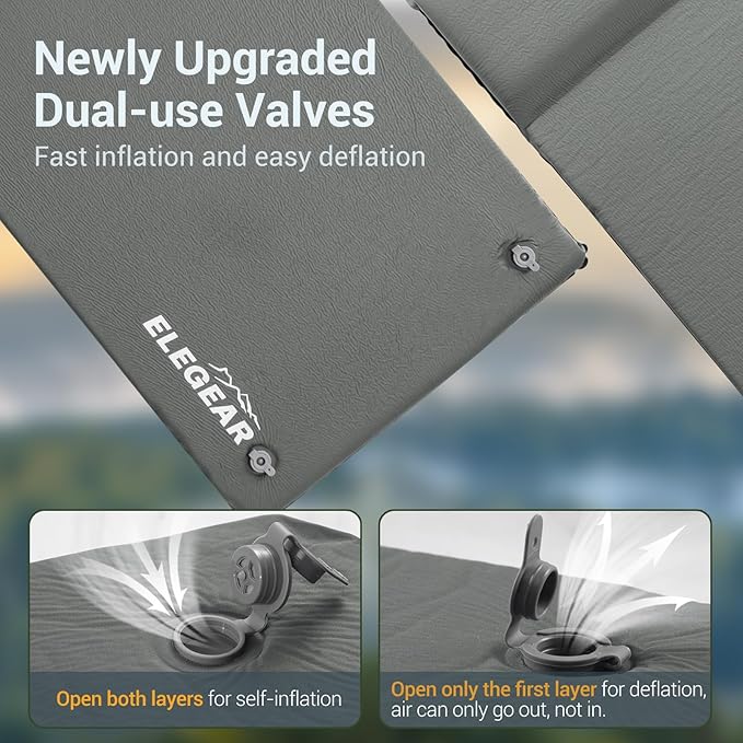 - Upgraded Valves For Easier Storage: Storage of foam sleeping mats has always been a challenge, and to make it easier, we have revolutionized the valve making it a dual-use valve. When inflating, simply open the two layers for self-inflating. When you need to deflate, OPEN ONLY THE FIRST LAYER and be sure to keep the second layer closed, in this state, air can only go out and not in, then you just need to squeeze out the air to complete the storage.
