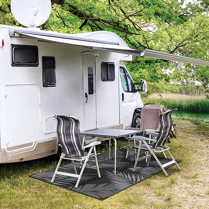 - Perfect Choice For RV Camping: Woven from lightweight plastic straws, these RV outdoor rugs can be easily folded down to a compact size to fit in our included carry bag. This portable waterproof outdoor rug allows you to take it outside easily, and also designed 4 corner loops with 4 stakes to help fix the carpet in place. Using this camper rug will relieve all the burden and fatigue of your RV trips and camping, allowing you to have plenty of imaginable space for more fun