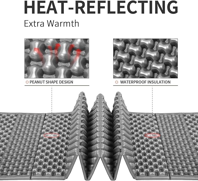 - 【Upgraded Version】The foam sleeping pad is covered with aluminum film, this extremely lightweight coating turns that surface into a very efficient heat reflector, amplifying warmth without the excess weight or bulk added, conventional insulating material is more moistureproof, more durability and easy to clean than the traditional model.