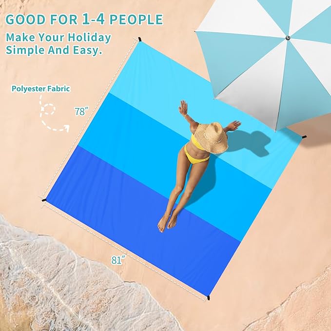 - ๐ดBeach Blanket Waterproof Sandproof:78''ร81''size beach blanket,suit for 1-4 adults.Made by parachute fabric,odorless,tear-resistant 210T polyester.Light weight and small after folding.Only 12 oz,small and mighty,which is easy to carry!