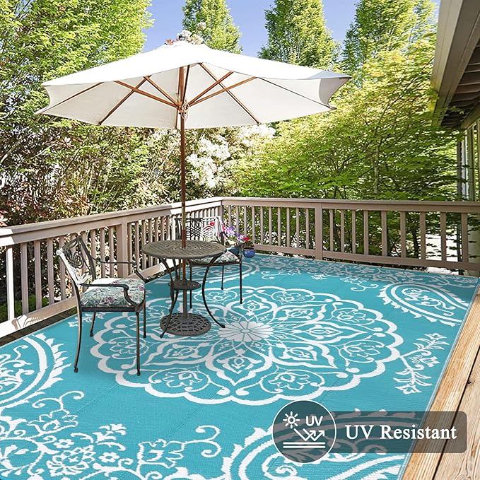Pauwer Waterproof Outdoor Rug 8x10, Reversible Plastic Straw Patio Camping Rug, Indoor Outdoor RV Mat Carpet for Deck, Camper, Porch, Balcony, Backyard, Picnic, Boho Teal