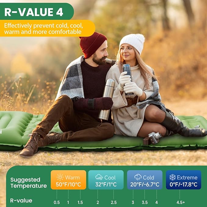 - ⛺【Warm & Comfortable Camping Pad】Our camping mattress is R-Value 4, effectively insulating coldness! The 3.9‘’ thick inflatable sleeping mat provides effective support to keep you away from the ground and ensure the warmth of the night! The front of the ergonomics pillow can fit the cervical spine, and the side can support the face. Various sleeping positions can make you feel relaxed and comfortable!
