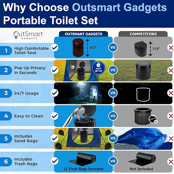 - 【All in One Portable Outside Toilet Set】Convenient for both new and professional campers of all ages, this toilet camping set includes a durable foldable toilet with a secure lid latch, 6ft 2in privacy tent, LED camping lantern (AA batteries not included), 8 ropes and stakes (4 extra included for backup), toilet trash bags, and 2 carry bags.