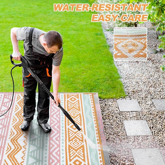 - REVERSIBLE AND VERSATILE: This plastic outdoor rug features universal colors and a reversible design, making it easy to refresh your outdoor space with just a quick flip. Suitable for use in any space or occasion, such as balcony, patio, porch, backyard, deck, beach, picnic, RV camping, etc.