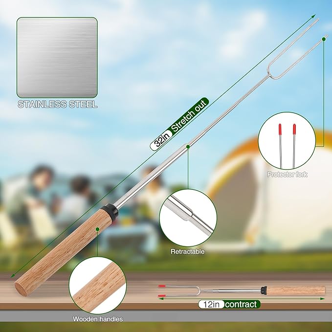 - Camper Must-Haves: Our campfire cooking equipment includes 4 S'mores sticks, 2 spice kits, and a brush, making it ideal for outdoor camping kitchens, BBQs, RV travel, and van life essentials. Gear up with this comprehensive camping kit for all your outdoor culinary adventures!