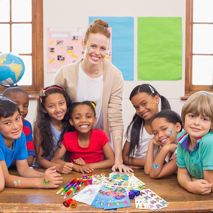 - Butterfly Party Favors Set: our Butterfly craft DIY set includes 12 coloring books(12 pages per book), 12 rainbow stacking crayons(8 colors),12 tattoos, 12 stampers, 12 DIY Art Craft stickers,12 pull back cars,sufficient quantity, and various styles enrich your butterfly birthday party