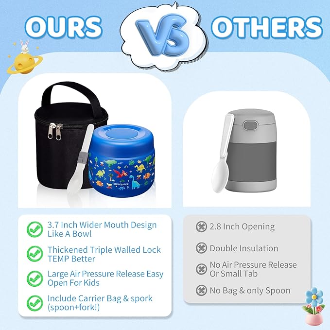 - UNIQUE PATTERN DESIGN: Our lunch thermo with kids' favorite patterns and cute character themes, designed to attract their attention to eat more food. on the other hand, a wide mouth makes eating less challenging for little ones getting the hang of using utensils, and the insulated soup thermo stay-cool touch won't harm their hands.