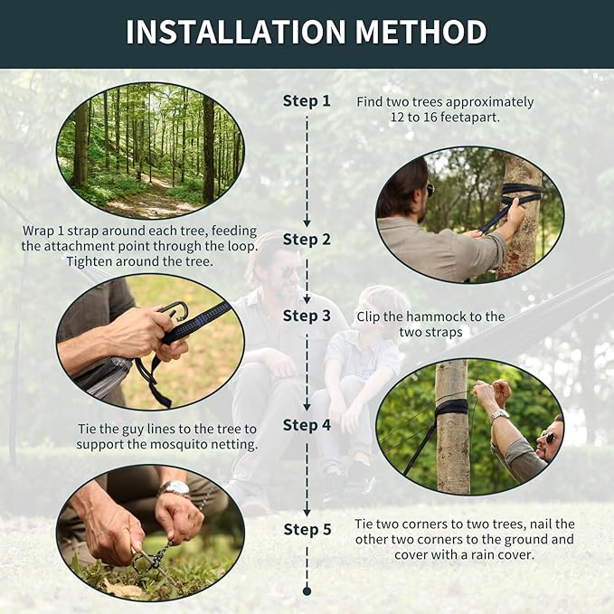 - 【BREATHABLE & PREMIUM NET】Do you hate being bitten by mosquito while camping? High density nets can effectively protect you from those creepy crawlers. Breathable and ventilated mesh allows you to safely enjoy your camping time. Net and hammock are connected by 2 quality zippers.If you want to know more details about using hammock, please move down on this page to find Product guides and documents, check Safety Information (PDF), you will get more instruction help