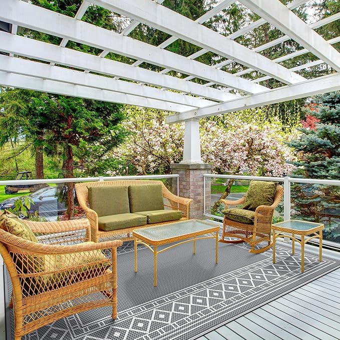 GENIMO Outdoor Rug Waterproof for Patio Decor, 6'x9' Reversible Plastic Straw Area Carpet, Camping Outside Mat for Outdoor, RV, Deck, Camper, Balcony, Picnic, Grey & White