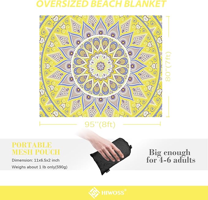 Beach Blanket Waterproof Sandproof Oversized 95โx 80โ,Sand Free Beach Mat with Corner Pockets,Portable Mesh Bag for Beach Festival,Picnic,Travel and Outdoor Camping (Yellowtan)