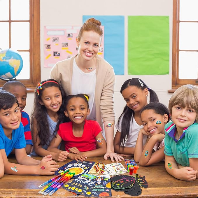 - Outer Space Party Favors Set: our outer space school DIY set includes 12 coloring books(12 pages per book), 12 rainbow stacking crayons(8 colors),12 tattoos, 12 stampers, 12 DIY Art Craft stickers,12 magic scratch art paper,sufficient quantity, and various styles enrich your space birthday party