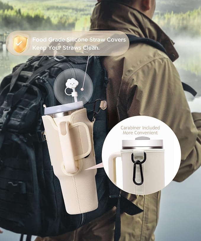 - 【Premium Neoprene Material】Our water bottle holder for stanley 40 oz tumbler accessories is made of neoprene, an environmentally friendly material, which not only protects the bottle from damage, but also effectively keeps warm or cold longer for your stanley tumbler(Note:Due to long term transportation, There is maybe slight odor, don't worry, the odor will dissipate in a few hours in a ventilated place .)